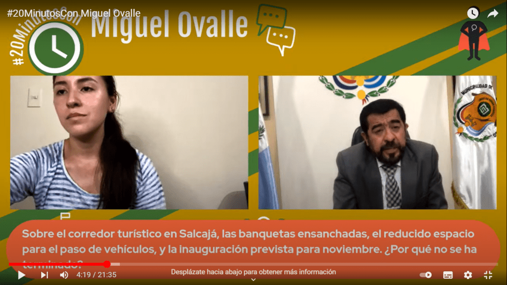 En una entrevista de 20 minutos se cuestionó a Ovalle sobre las problemáticas que afectan a los pobladores de Salcajá y la disminución de la ejecución presupuestaria en su municipalidad mientras presidió la Anam. Además, respondió preguntas sobre su desempeño como jefe edil durante una década y cuál es el futuro de su ciudad respecto a la calidad de los servicios públicos.