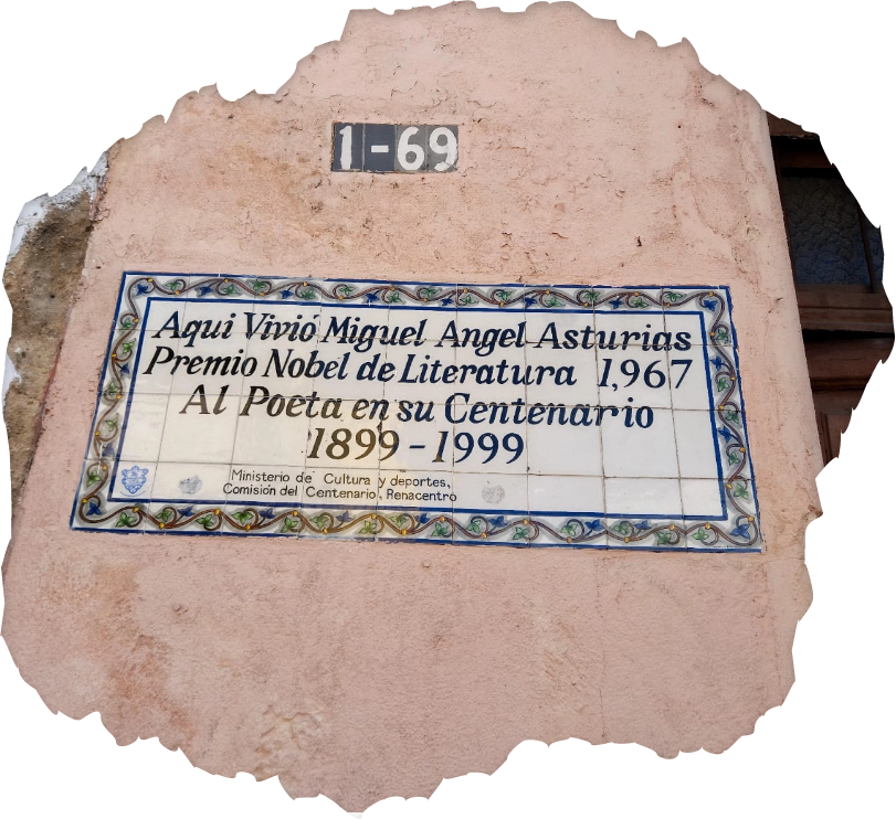 “Aqui Vivió Miguel Angel Asturias Premio Nobel de Literatura 1,967. Al Poeta en su Centenario 1899-1999” (sic) reza una plaqueta que permanece en la 14 avenida 1-69 zona 1.