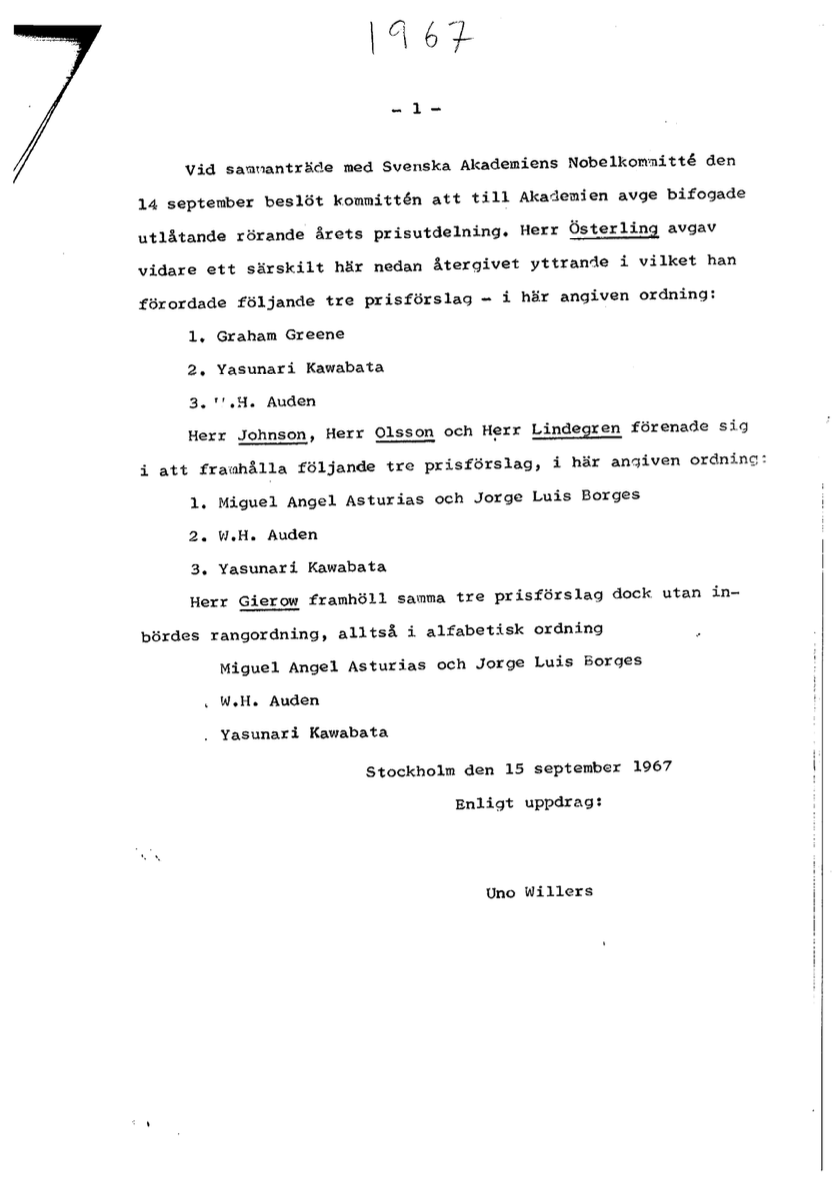 El documento del Comité Nobel de Literatura con fecha 14 de septiembre de 1967, al que Ojoconmipisto tuvo acceso, contiene por orden alfabético unas líneas de la discusión sobre cada escritor. Las trece páginas hacen referencia a las 70 propuestas, 17 de ellas nuevas, para terminar con los nombres de los cinco finalistas. Otro listado contiene el nombre del nominado y datos de su nominador.