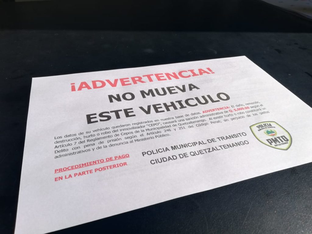 La mayoría de casos, la población denuncia vehículos mal estacionados. Llega un agente de la Policía Municipal de Tránsito de Quetzaltenango (PMTQ) a verificar, toma una fotografía que envía al centro de monitoreo, coloca el cepo y deja una nota de precaución para no mover el vehículo.