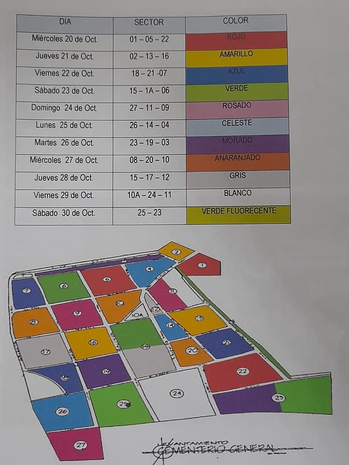 Del 16 al 24 de octubre podrán entrar 50 personas diarias al cementerio solo si su propósito es reparar o pintar los mausoleos. Por otro lado, quienes deseen adornar y visitar las bóvedas podrán hacerlo del 25 al 28 de octubre, y del 3 al 5 de noviembre. A esto solo podrán entrar grupos de 20 personas, las cuales pueden estar allí hasta media hora.
