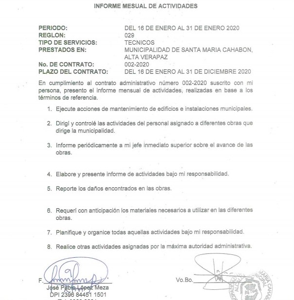 Para que López Meza reciba este dinero es necesario que ejecute las actividades encomendadas por sus superiores y elabore un informe mensual de su trabajo. Según Guatecompras, él ha cumplido con este requerimiento mes a mes: el primer informe detalla las actividades de enero, que son idénticas a la descripción del contrato sobre el puesto. Los informes siguientes son similares entre sí, con dos o tres cambios en cada documento si hizo algo diferente respecto al mes anterior.