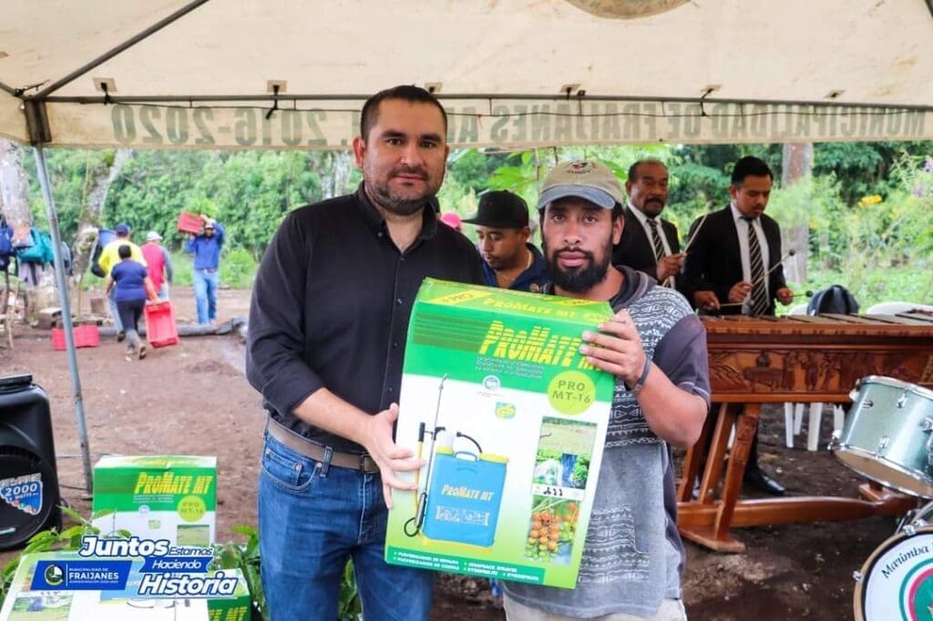 El 31 de mayo, la comuna citó en una de las colonias de Fraijanes a los vecinos que se inscribieron en el programa de “caficultores”. Ese día se entregaron pilones de café y bombas de fumigación. Berreondo asistió a la actividad y se fotografió con los beneficiarios.