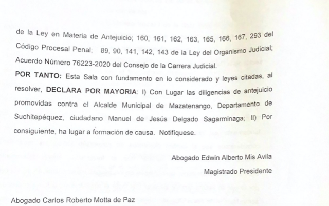 Hubo varias diligencias en estos años en la que la Corte de Constitucionalidad le ordenó a Sala Regional Mixta de la Sala de Apelaciones de Retalhuleu conocer el caso. En una resolución de dos a uno resolvieron con lugar las diligencias de antejuicio contra el jefe edil.