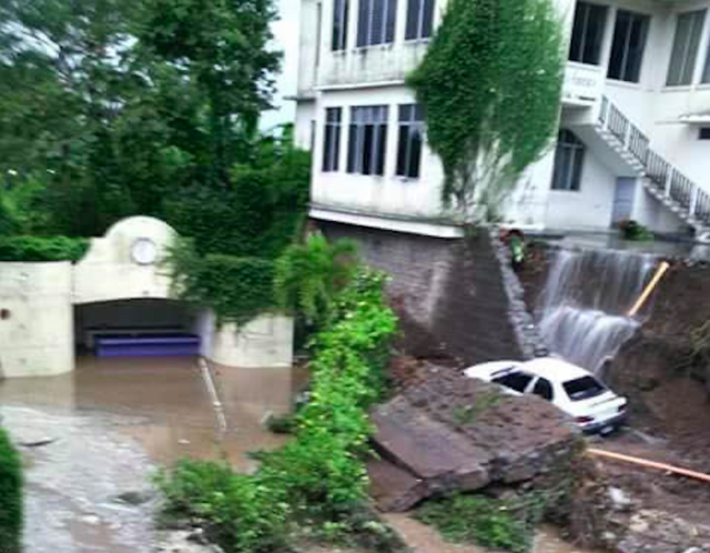 Esta vía que da entrada a los viajeros procedentes de Retalhuleu y Quetzaltenango está cerca de dos riachuelos que en verano apenas llevan agua, pero en época de lluvia inundan todo a su paso. En 2016 hubo tres inundaciones: el 31 de agosto, el 16 y el 22 de septiembre, la peor fue esta última. “Fue tal la fuerza que el agua botó el muro de contención, arruinó la piscina del hotel y uno de los vehículos de los huéspedes cayó dentro de esta”, explicó.