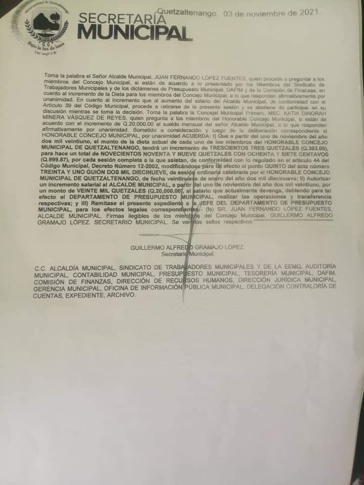 Además, plantearon que el sueldo del alcalde, Juan Fernando López, debía tener un aumento de Q25 mil, al final acordaron Q20 mil.