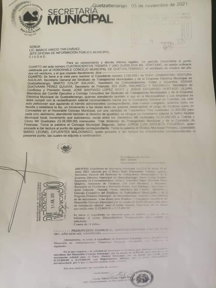 El punto 4 del acta 431–2021 de sesión ordinaria, celebrada el 27 de octubre da cuenta que la propuesta de aumento fue presentada por Rudy Diamantino Ventura Aguilar, Marto Colop Salanic, Edgar Giovanni Pérez Quijivix, Edi Zoel Racancoj, José Santiago Ixcot y Jesús Estuardo Hurtado Uluan, todos miembros del Comité Ejecutivo y Consejo Consultivo del Sindicato de Trabajadores Municipales y de la Empresa Eléctrica.