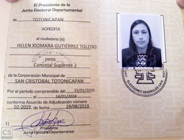 Helen Xiomara Gutiérrez Toledo trabaja en la oficina de atención al adulto mayor de San Cristóbal Totonicapán desde hace cinco años. En las pasadas elecciones, además, resultó electa como concejal suplente II de su municipio, con el partido Humanista.