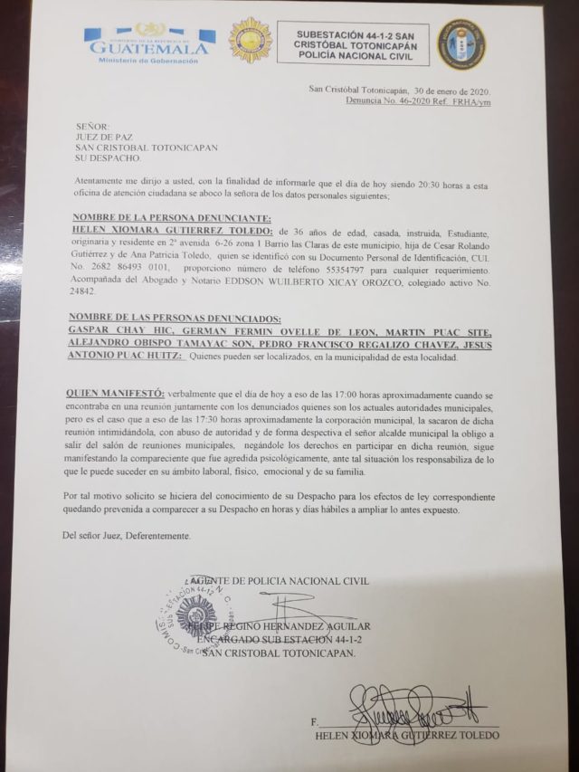 En la sesión extraordinaria celebrada el 30 de enero, los miembros del concejo la expulsaron, ella los denunció ante el Ministerio Público (MP) y la Policía Nacional Civil (PNC). Gutiérrez es la única mujer de la corporación municipal.