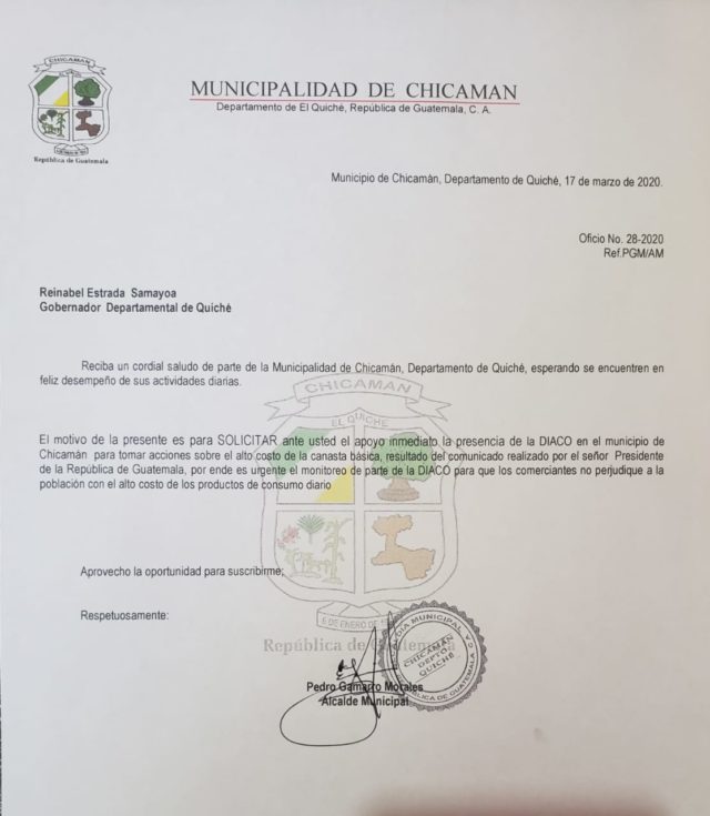 El alcalde de ese municipio, Pedro Gamarro Morales, solicitó la presencia de la Diaco y del Procurador de los Derechos Humanos (PDH) para detener la especulación de precios. En Santa Cruz del Quiché y Joyabaj realizaron recorridos en conjunto con la Diaco.