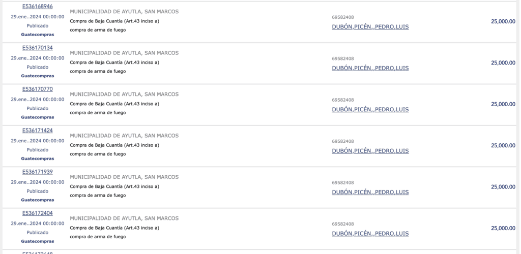En Guatecompras hay 21 adquisiciones de baja cuantía del 29 y 22 de enero por Q25 mil cada una (en total Q525 mil), cuya descripción es «compra de arma de fuego para la municipalidad». También por baja cuantía, Q14 mil 400 en compra de cartuchos calibre .223 REM, para armas de un tiro a la vez. Todo se lo adquirió al mismo proveedor: Pedro Luis Dubón Picén.