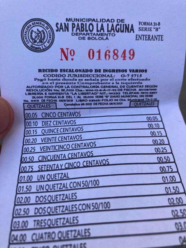Primero, los agentes de la Policía Municipal de Tránsito (PMT) de San Pablo la Laguna extienden un recibo de ingresos varios con el sello de la Contraloría General por un cobro de Q5.