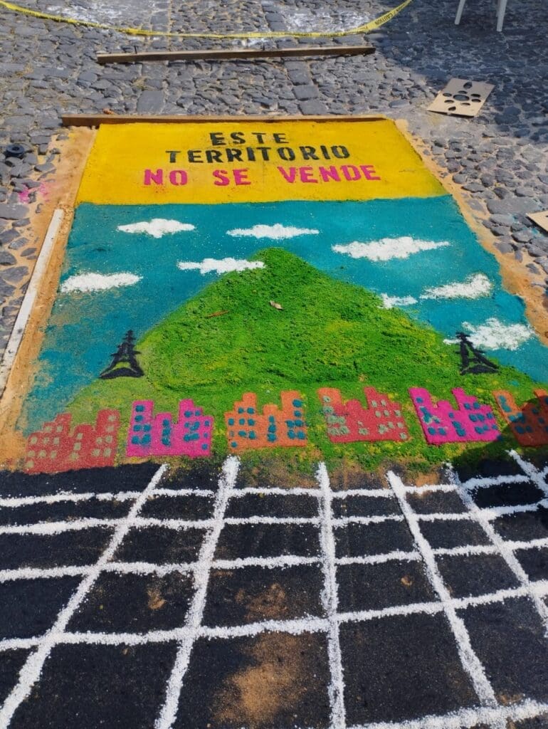 “Este territorio no se vende” y “Un POT para la gente”, se leía en una alfombra con aserrín de colores el Jueves Santo, sobre la 1a. avenida Norte, entre 3a. y 4a. calles de La Antigua Guatemala. Pero el anda de Jesús Nazareno del Perdón no logró pasar sobre ella porque Juan Diego Arriola Gallina, concejal I e integrante de la hermandad del templo franciscano, ordenó a un pelotón de romanos destruir el mensaje.