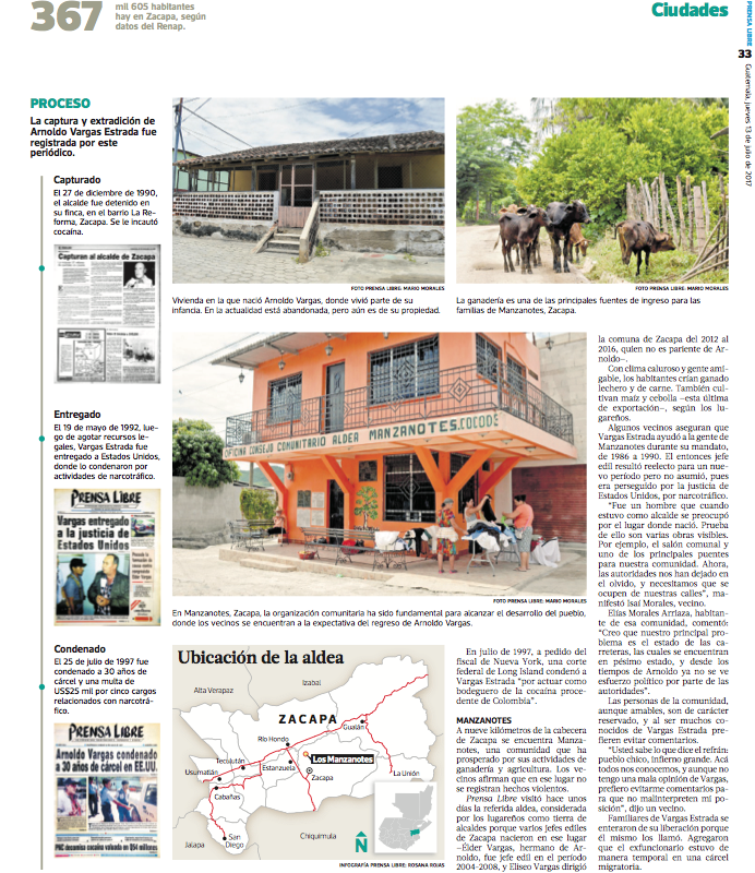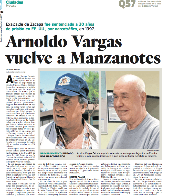 Se refiere, claro, a los negocios ilícitos que forjaron su nombre en los años 80, le hicieron alcalde en 1985 y le dieron la reelección en 1990. A los mismos que llevaron a la extradición de Arnoldo Vargas en el 92 y, según fuentes en sucesivos gobiernos de Guatemala, siguieron alimentando el poder político y territorial de la familia Vargas mientras su patriarca estuvo en la cárcel. Los negocios de narcotráfico que hoy, en 2023, reinan todavía en Zacapa.