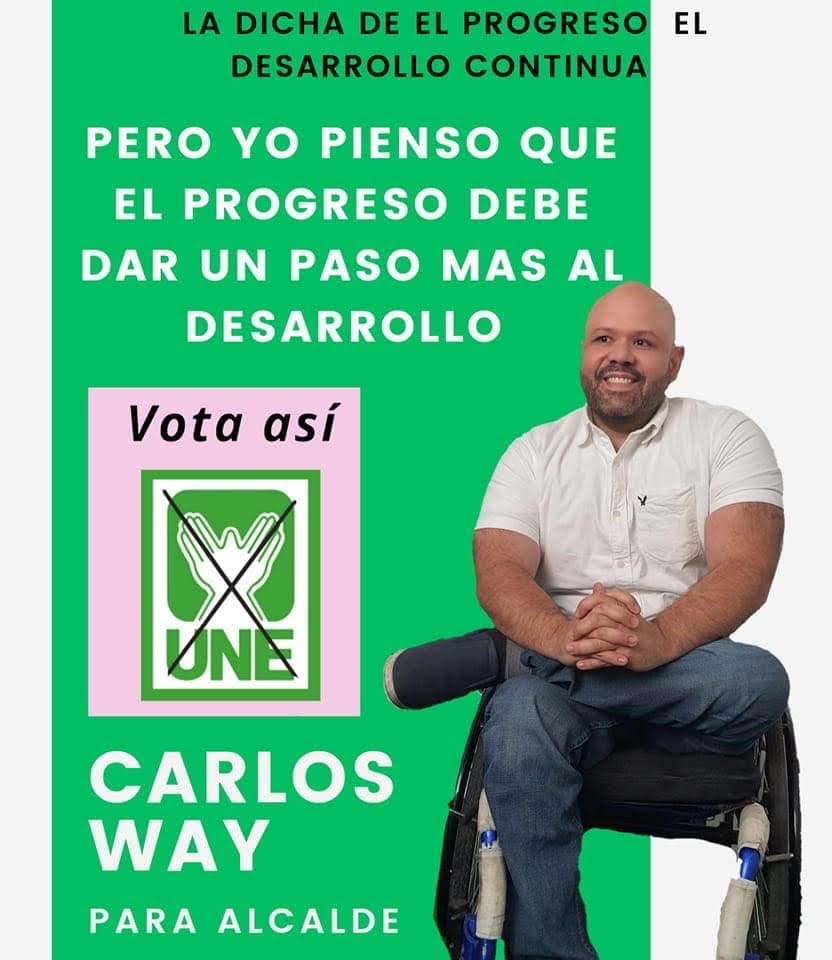 En El Progreso, Jutiapa, Carlos Way es uno de los cinco candidatos a alcalde, participa con la Unidad Nacional de la Esperanza (UNE). En su silla de ruedas recorre las calles de su municipio para presentar su propuesta de trabajo “para lograr el desarrollo local”, dijo.