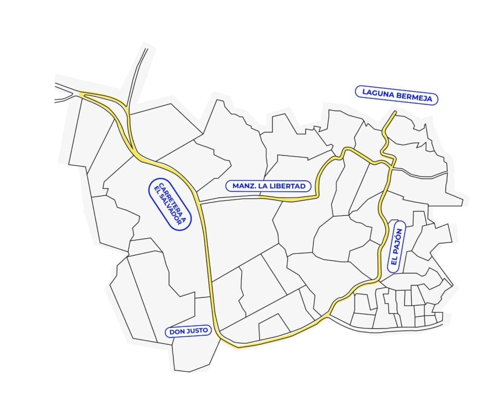 La segunda línea tendrá tres buses y aunque aún no se habilita, acercará a los usuarios a carretera a El Salvador. Allí, el transporte tendrá paradas en Manzano la Libertad y Laguna Bermeja para tomar después la calle principal de El Pajón y conectar la carretera principal. Tras ello, retornará en Condado Concepción y llegará al sector de la iglesia Esquipulas en don Justo.