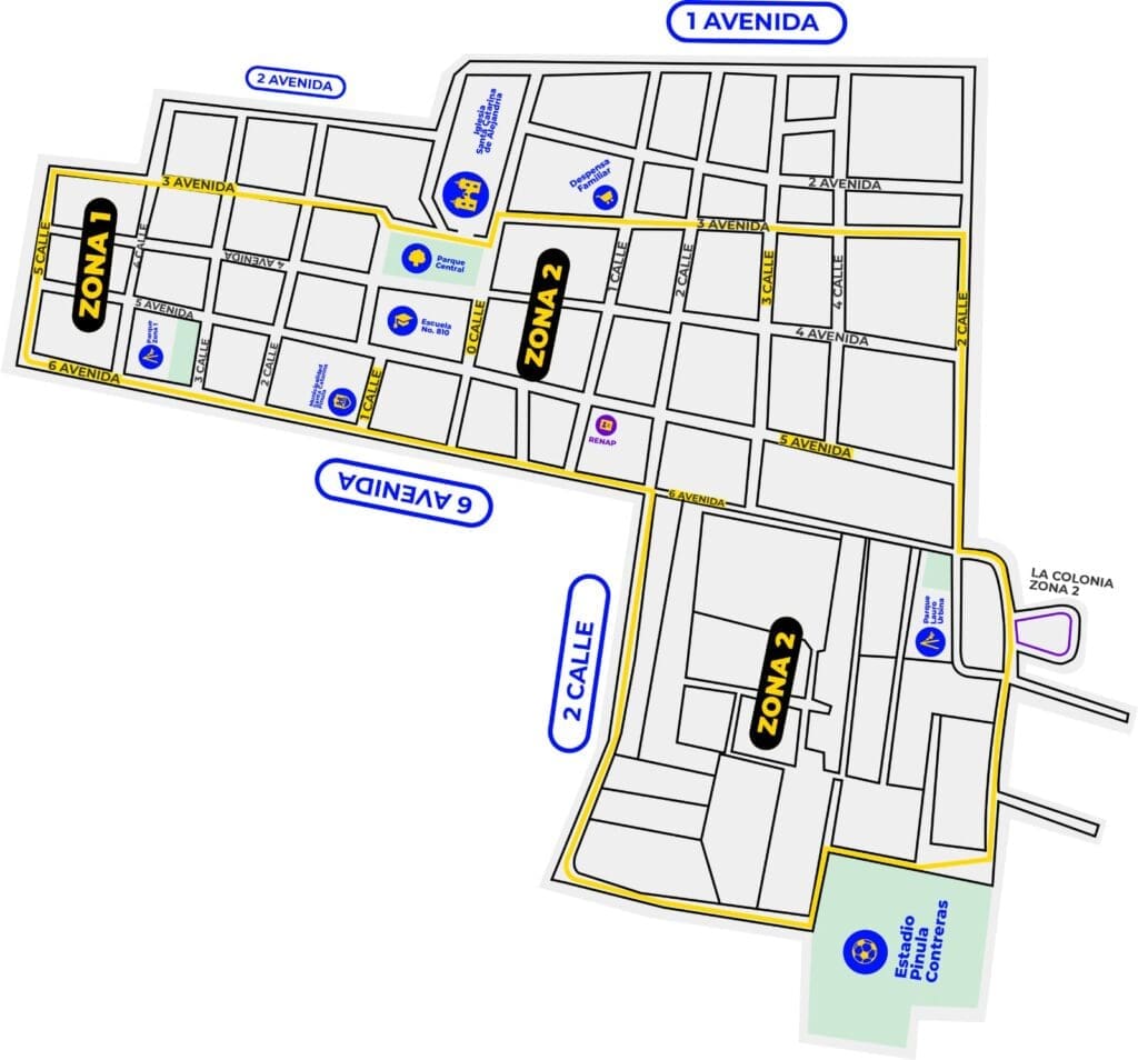 En la zona 2, en tanto, el trayecto inicia al lado de la comuna, transita por la sexta avenida, cruza en la segunda calle y llega al estadio. Luego regresa a la quinta calle, toma la tercera avenida y se dirige al parque una vez más.