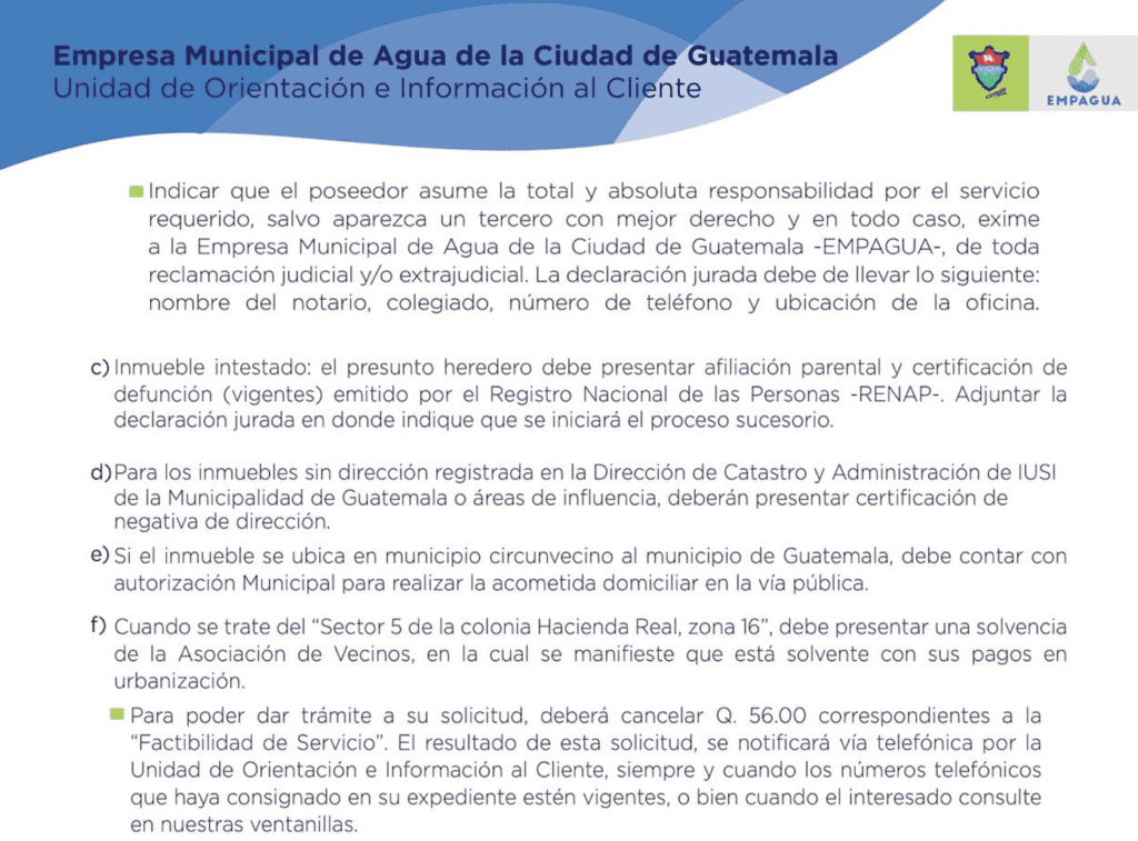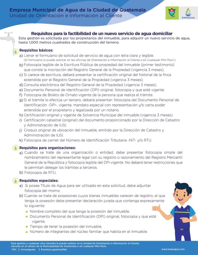 Para tramitar la conexión de agua por primera vez, se puede acudir a cualquier Mini Muni o a las oficinas de orientación y atención al cliente. Allí se debe llenar un formulario y entregar cierta papelería; si es residencial o empresarial.
