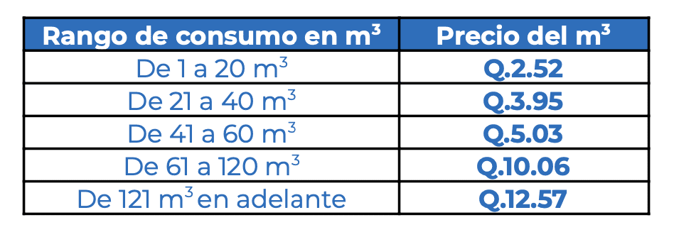 En Ciudad de Guatemala no se paga una cuota fija por el servicio de agua contratado con la alcaldía, sino que el monto equivale al consumo de metros cúbicos por usuario. Estos son los precios según el rango de consumo: