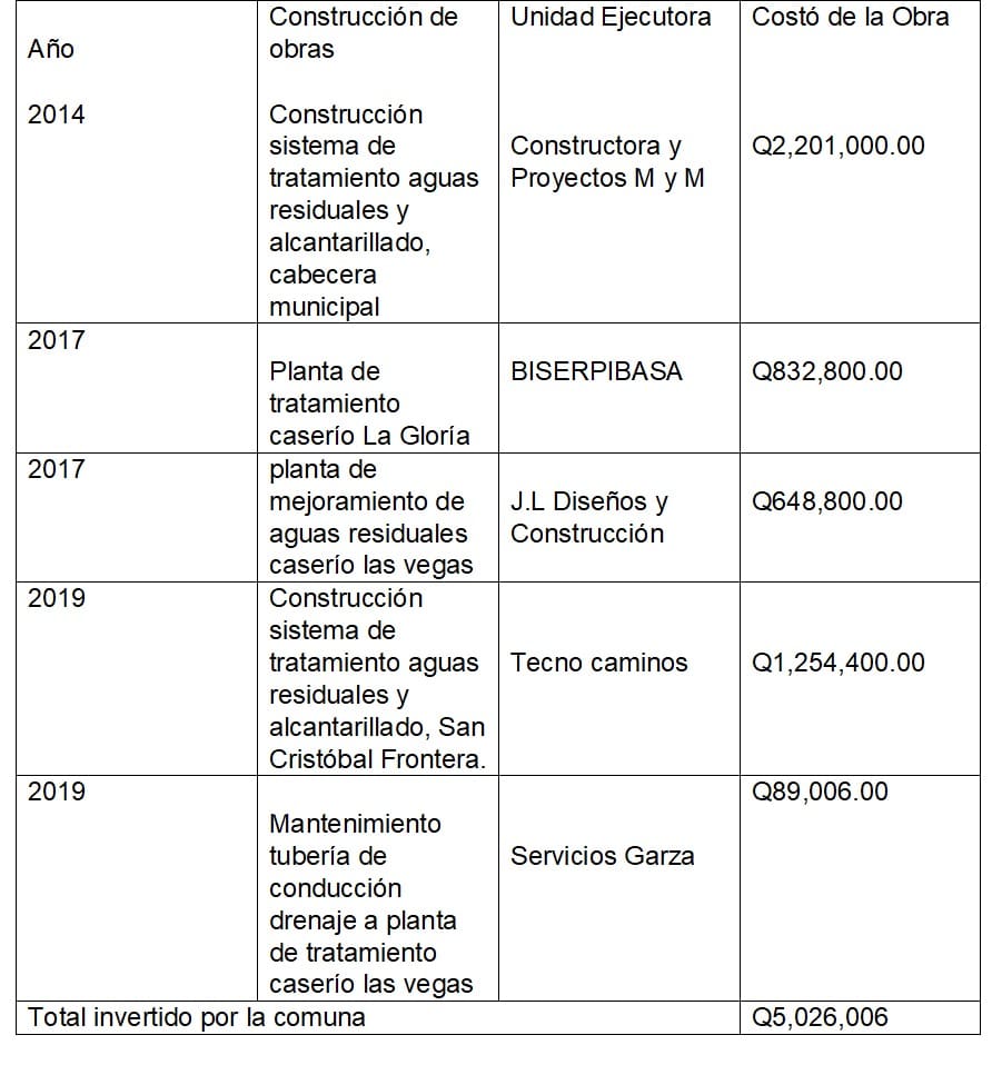 En 2014 se ejecutó la primera de tres plantas de tratamiento en Atescatempa, Jutiapa, por Q2 millones 201 mil (NOG 3389448) a cargo de Constructora Proyectos M y M. Se localiza en la cabecera municipal y no funciona, reconoció el alcalde José Mauricio Contreras. Este es su segundo período no consecutivo el cual ganó con Unión del Cambio Nacional (UCN) y esa obra es de la administración anterior.