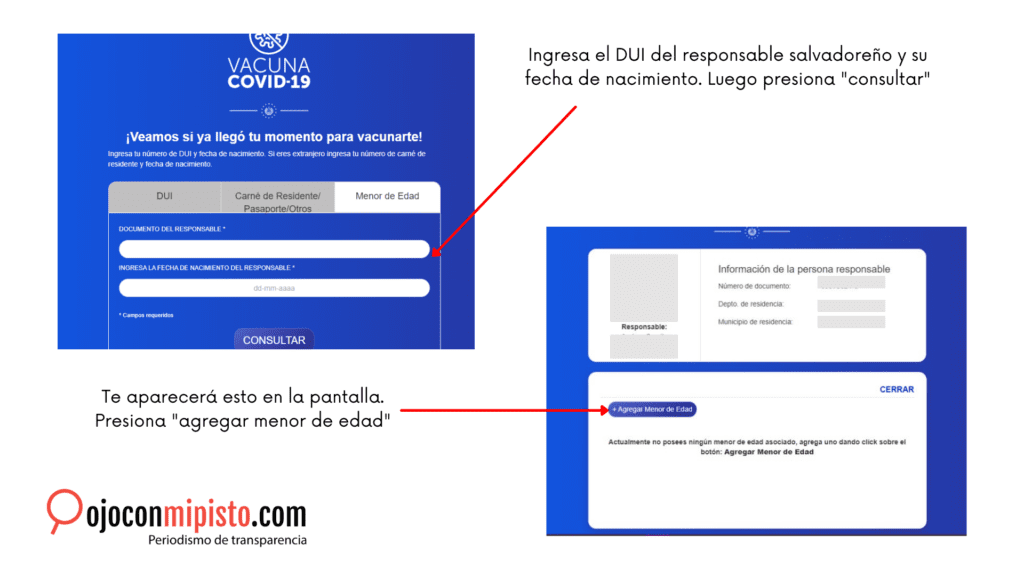Para inscribir a un niño se debe ingresar al portal habilitado por el Minsal y presionar “menor de edad”. Allí se anotan los datos del adulto responsable.