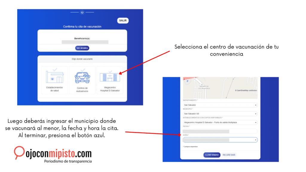 Selecciona el lugar, hora y fecha para vacunar al menor de edad.