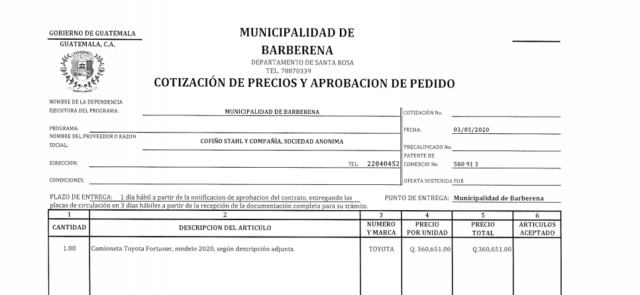 En Guatecompras no figura la factura de la compra, solo el acta de adjudicación, pero no especifica la línea ni el modelo del vehículo. Personal de la unidad de compras de la corporación edil dijo que la documentación no aparece porque aún no han pagado ni recibido el vehículo. Pidieron que cualquier consulta sobre los detalles de la camioneta se hiciera por información pública.