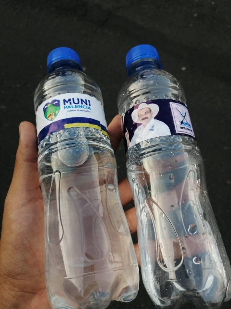 Entre estas aparece en el portal de Guatecompras un gasto de Q2 mil 400 en la adquisición de 800 botellas de agua pura “para el desfile hípico”, que llevaban impreso el logo de la municipalidad de Palencia, del partido que lo postula y la foto de Reyes.