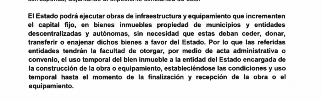 Por su lado, el abogado Goyo Saavedra, considera que el texto del párrafo que se quiere agregar, ayudará a ejecutar obras públicas en propiedad de municipalidades y entidades descentralizadas y autónomas.