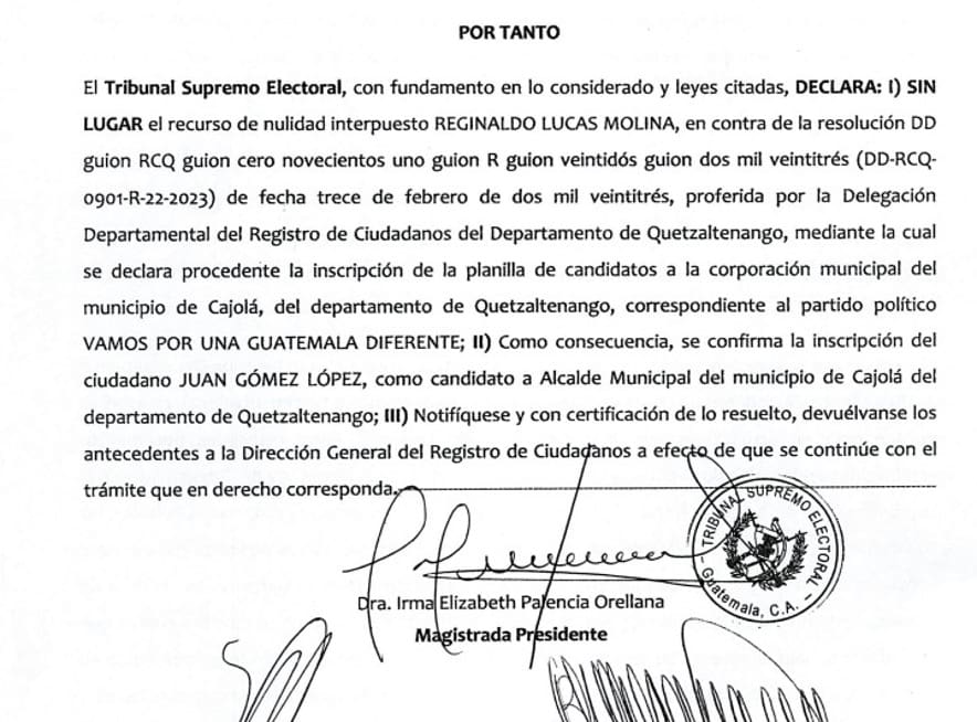“Debido a que no existe sentencia condenatoria y para no vulnerar el derecho de participar se procede a la inscripción de la planilla municipal de Cajolá por el partido Vamos por una Guatemala Diferente”, se lee en la resolución del TSE emitida el 28 de febrero.