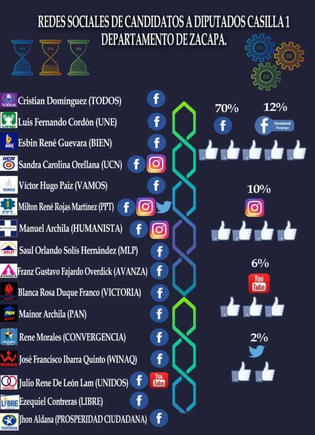 Las edades de los aspirantes oscilan de los 19 hasta 60 años. La mayoría maneja sus redes sociales, y otros poseen rectores. “Intenté hacer propaganda en Twitter, pero Zacapa no conoce esa red, Instagram lo manejan muchos adolescentes; así que Facebook era el idóneo” expresa Miltón Rojas, candidato de Productividad y Trabajo PPT.