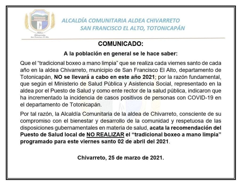 La alcaldía comunitaria de la aldea Chivarreto, de San Francisco El Alto, Totonicapán, informó a través de un comunicado en su fanpage que no realizarán su «tradicional boxeo a mano limpia» este Viernes Santo, 2 de abril.