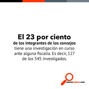 El 30 por ciento de los alcaldes (12 de 40) ha sido sujeto de un proceso de antejuicio. Y al menos un miembro de los 40 concejos municipales, investigado por el Ministerio Público y/o la Contraloría General de Cuentas o procesados por algún caso. El 23 por ciento tiene una investigación en curso ante alguna fiscalía. Es decir, 127 de los 545 investigados.