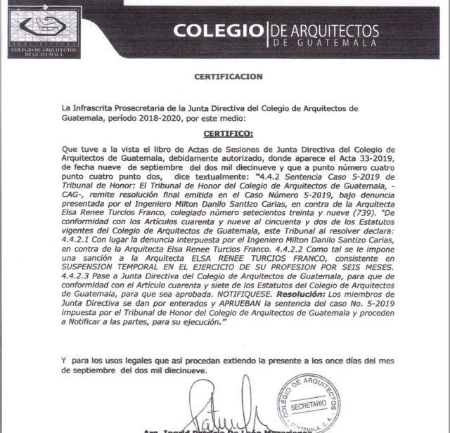 El Tribunal de Honor del Colegio de Arquitectos suspendió por seis meses a Elsa Renee Turcios Franco, la arquitecta supervisora del Munitec de zona 18 que está paralizado desde marzo de 2018. La sanción provino de una denuncia a cargo de la Asamblea General del Colegio de Profesionales que tomará una decisión final de cómo proceder, incluso con acciones legales.