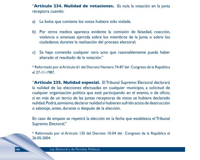 El artículo 234 de la Ley Electoral y de Partidos Políticos (LEPP) establece que la votación en una junta receptora (la agrupación que recibe los votos en el centro) puede anularse solo si: la bolsa con las papeletas fue violada, se ejerció coacción, amenazas o violencia sobre los ciudadanos durante el proceso. O se cometió cualquier otro acto que pudiera alterar el resultado de la elección.
