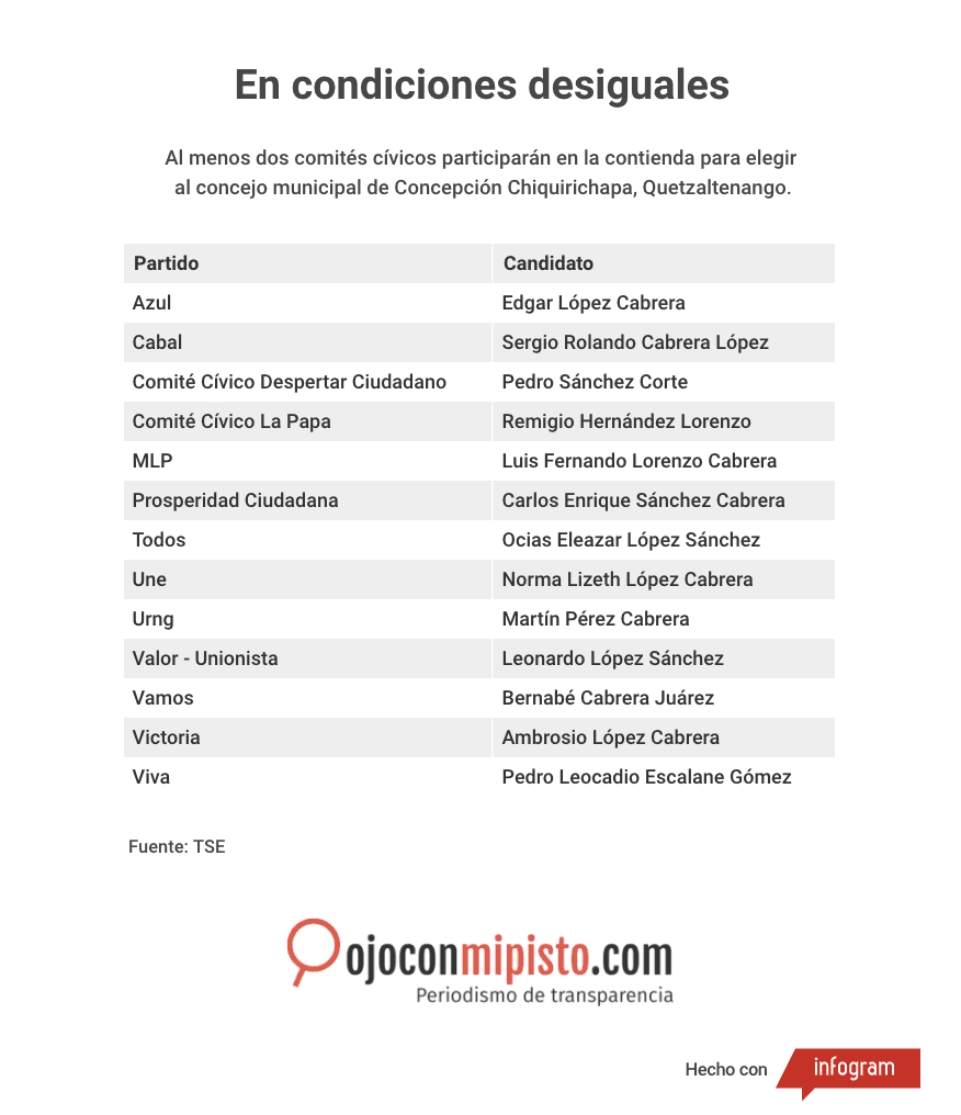 Los comités cívicos “La Papa” y «Despertar Ciudadano” postulan candidatos para integrar corporaciones municipales en Concepción Chiquirichapa, Quetzaltenango. El primero es con el que el alcalde Remigio Hernández Lorenzo busca la reelección.