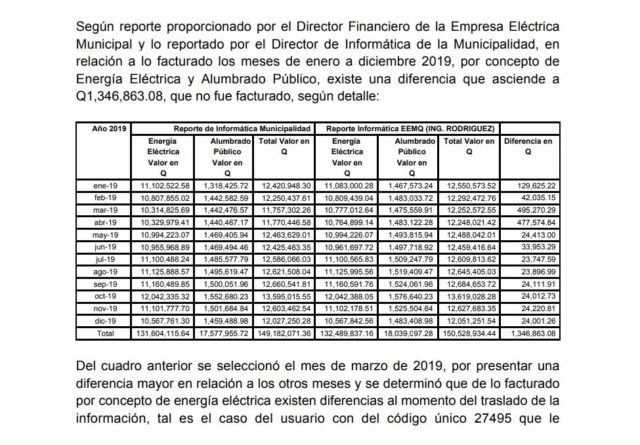 En el caso de la EEMQ, la dependencia no trasladó adecuadamente sus datos al departamento de informática. Por concepto de energía eléctrica y alumbrado público, existe una diferencia que asciende a Q1 millón 346 mil 863.08. Además, tampoco informó al ministerio de Finanzas sobre el aumento en las dietas por reunión.