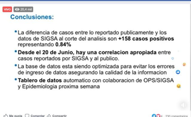 La auditoría presentada por Asturias y Flores en conferencia de prensa virtual concluyó que la diferencia de casos de SIGSA con los de Salud al corte del análisis fueron 158 casos positivos, lo cual representa un 0.84 por ciento de diferencia. Desde el 20 de junio hay una correlación apropiada entre ambos sistemas. La base de datos se seguirá mejorando en los próximos días.