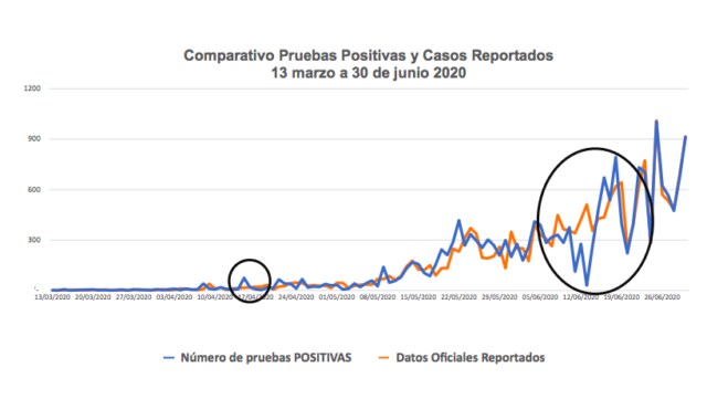 Una de las modificaciones que presentó Salud en los últimos días es el horario de cierre para procesar las estadísticas de la pandemia. Antes, el reporte se daba actualizado hacia las 15:00 horas del mismo día. Desde el jueves 26 de junio se empezó a reportar los datos de la fecha anterior a partir de las pruebas realizadas entre las 00:00 horas a las 23:50.