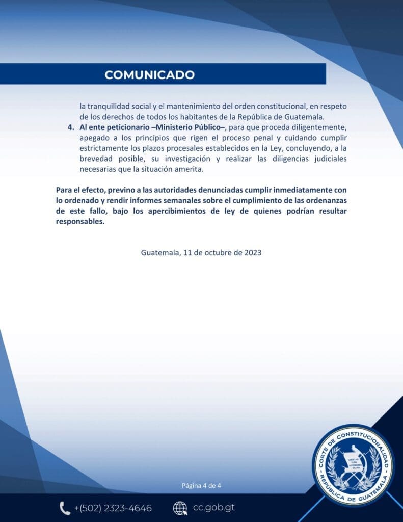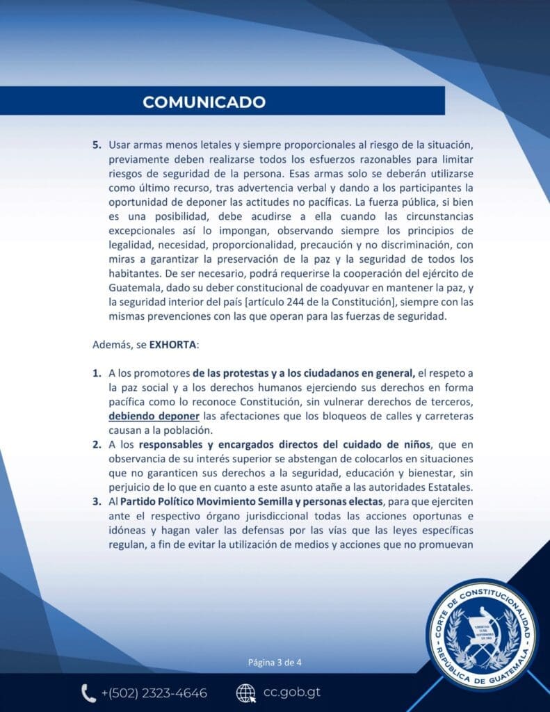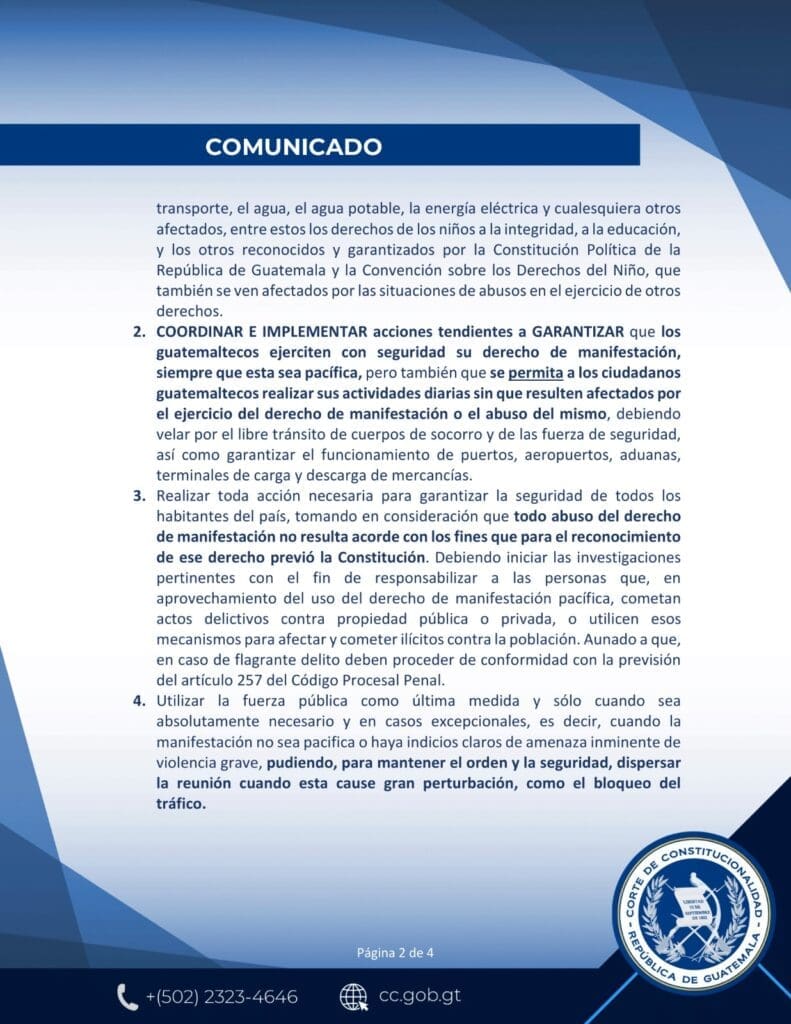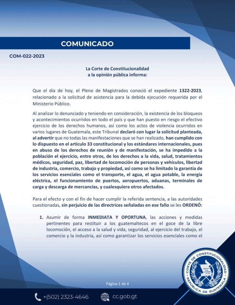La Corte de Constitucionalidad (CC) emitió un comunicado luego de conocer el expediente 1322-2023 presentado por el Ministerio Público (MP) en contra de las manifestaciones en desarrollo desde hace diez días.