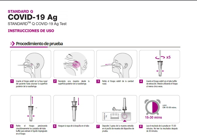 Este tipo de reactivos que se utilizan proviene del laboratorio SD Biosensor, marca Estándar Q COVID-19 AG. El resultado de estas pruebas se obtiene en un máximo de 30 minutos, según la ficha técnica del producto, aunque tienen una efectividad del 84 por ciento.