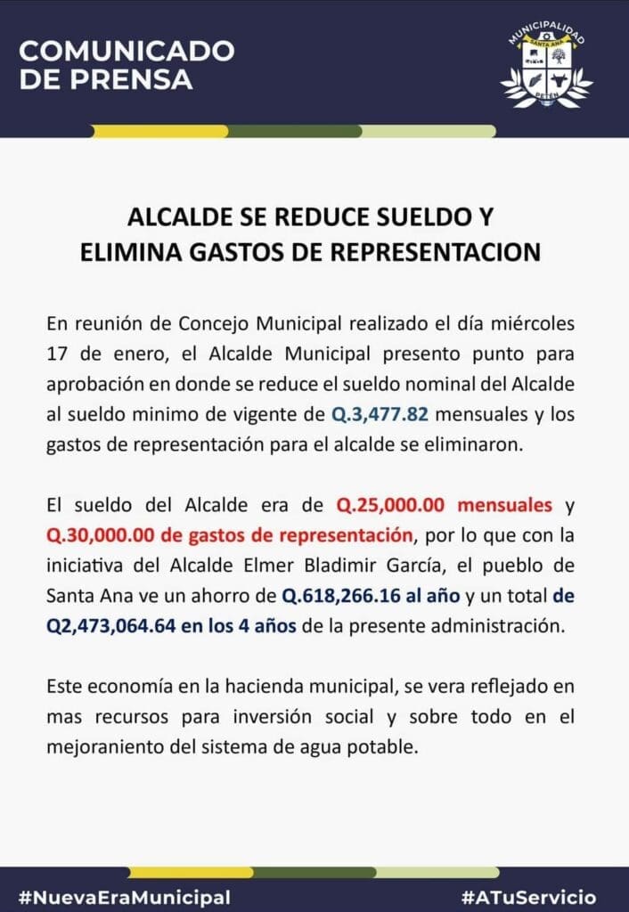 En la primera semana de gobierno de la administración 2024 – 2028, en cambio, cuatro jefes ediles hicieron lo contrario. El de la cabecera de Jutiapa, Oscar Pineda, redujo su salario a la mitad y estableció ad honorem las dietas del concejo. En tanto, el de Santa Ana (Petén), Elmer García, lo redujo para ganar el salario mínimo y eliminó los gastos de representación.