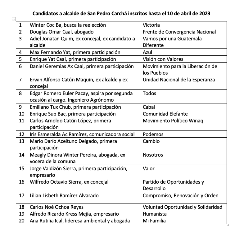 Las candidatas para las elecciones 2023 son la lideresa ambiental y abogada Rutilia Ical, del partido Mi Familia; la comunicadora social Iris Esmeralda Ac Ramirez, por Podemos; la ex vocera de la comuna y abogada Meagly Dinora Winter Pereira, de Nosotros, y Lilian Lisbeth Ramírez Alvarado, de Compromiso, Renovación y Orden.