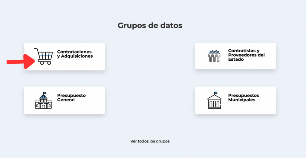 Al inicio del portal, al deslizar hacia abajo, se encuentran los botones de los conjuntos de datos disponibles. Para visualizar los concursos NOG adjudicados en 2025, se debe seleccionar “Contrataciones y Adquisiciones”.