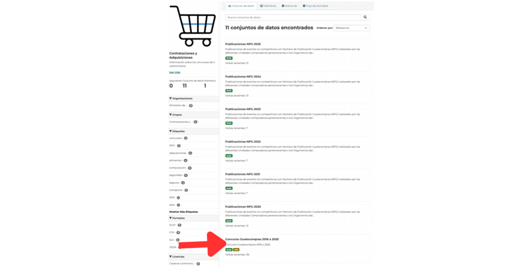 Cuando el usuario ingresa a la ventana de contrataciones, el portal despliega varias hojas de excel o conjuntos de datos. Para enfocarse en los concursos adjudicados por las municipalidades, se selecciona el apartado nombrado “Concurso Guatecompras 2016 a 2025”.