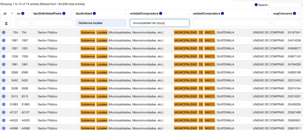 La especificidad de los datos se logra por medio de filtros. Cada columna tiene su propio buscador. Para encontrar los datos de gobiernos locales, el usuario debe escribir en la burbuja de búsqueda la entidad.