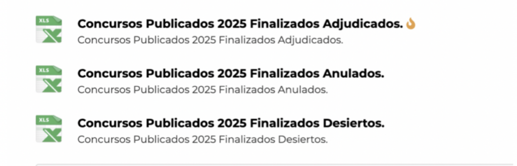 Tras seleccionar el botón de concursos del año 2016 a 2025, el usuario debe deslizar hacia abajo. Hasta el final de la lista, se encuentran los datos del año corriente (2025).