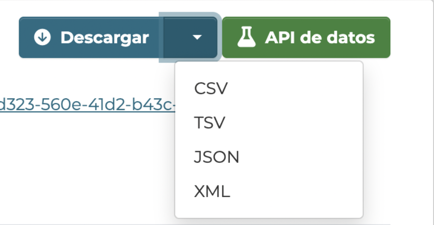 El portal, como otros sitios de transparencia, permite la descarga de los datos en diferentes formatos. Los disponibles son los siguientes: