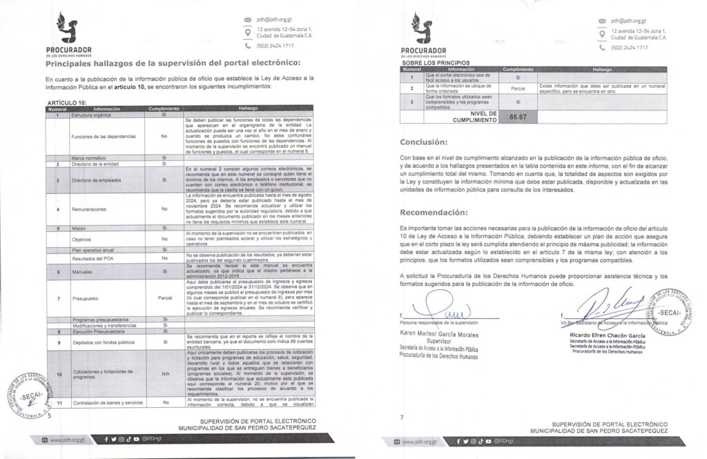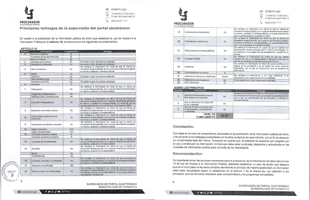 Según la primera evaluación al cumplimiento del art 10 realizada por la Secretaría de Acceso a Información (Secai) de la PDH, calificó de “deficiente” a las tres comunas por no cumplir con todos los incisos de la ley.