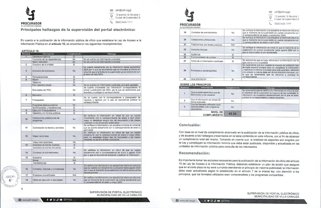 Villa Canales en la primera supervisión del 4 de febrero de 2025, obtuvo 47.24 puntos catalogado como deficiente. Según el informe cumplió con 17 de los 41 aspectos calificados. Dentro de sus principales incumplimientos destaca la actualización del directorio de empleados y su POA, entre otros.
